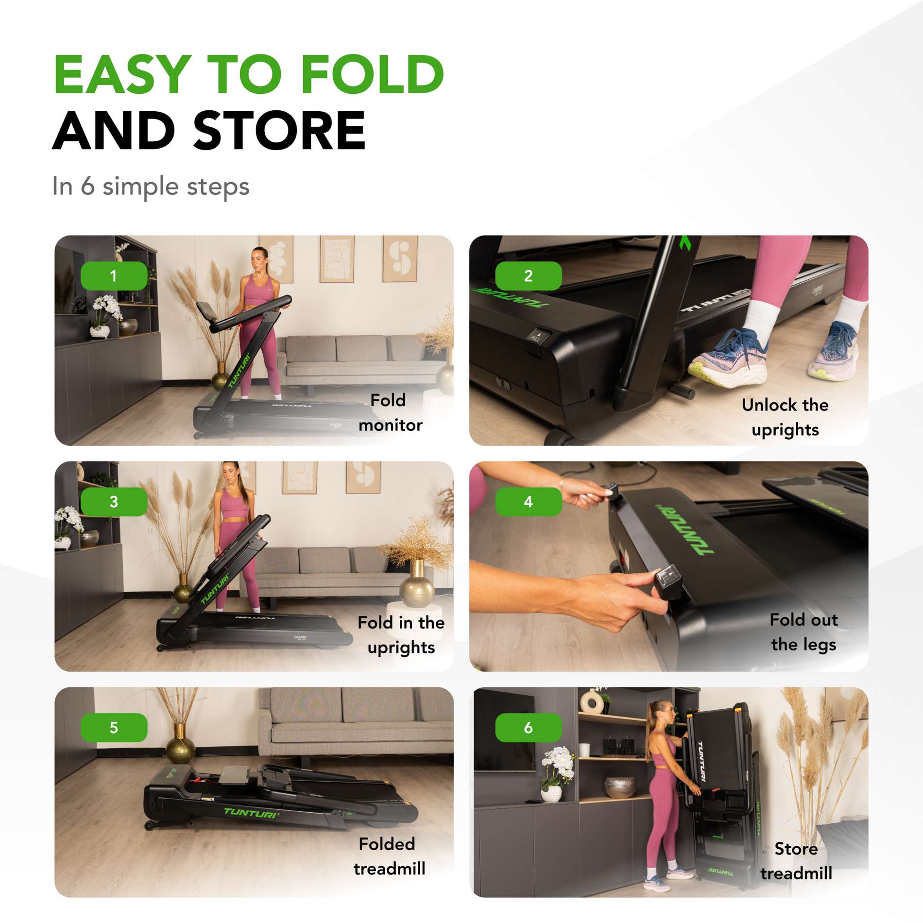 NB! Jooksulint on karbis juba kokkupandud ning ei vaja eraldi monteerimist. Avage pakend, tõstke käepidemed üles, lukustage need, pange ekraan sobiva kalde alla ning alustage treenimist.