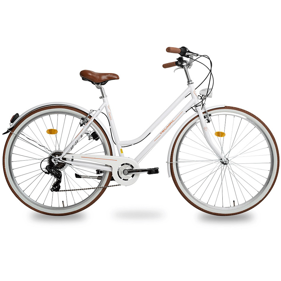 Klassikaline naiste jalgratas Romet Triumph on mõeldud naistele, kes armastavad stiili ja praktilisust ühes. Pehme ja lai sadul, suured 28-tollised rattad ning tasakaalustatud raamigeomeetria teevad Triumphi väga mugavaks linnarattaks, millel saad istuda ja sõita sirge seljaga. Praktilisust lisavad tugev pakiraam kinnitusrihmadega, ketikaitse, porilauad, tuled ja seisujalg.