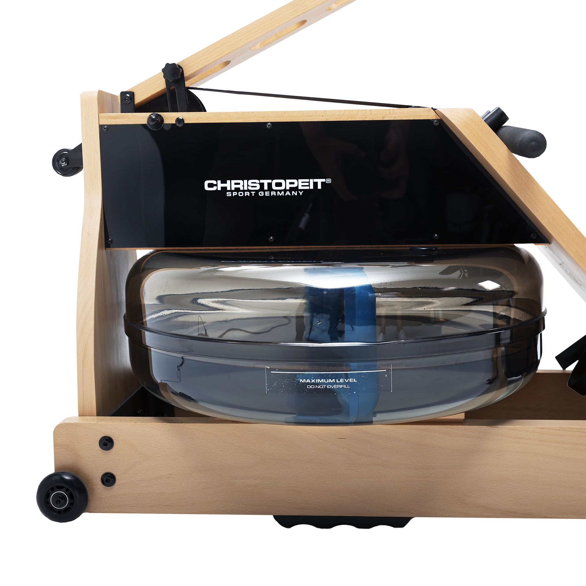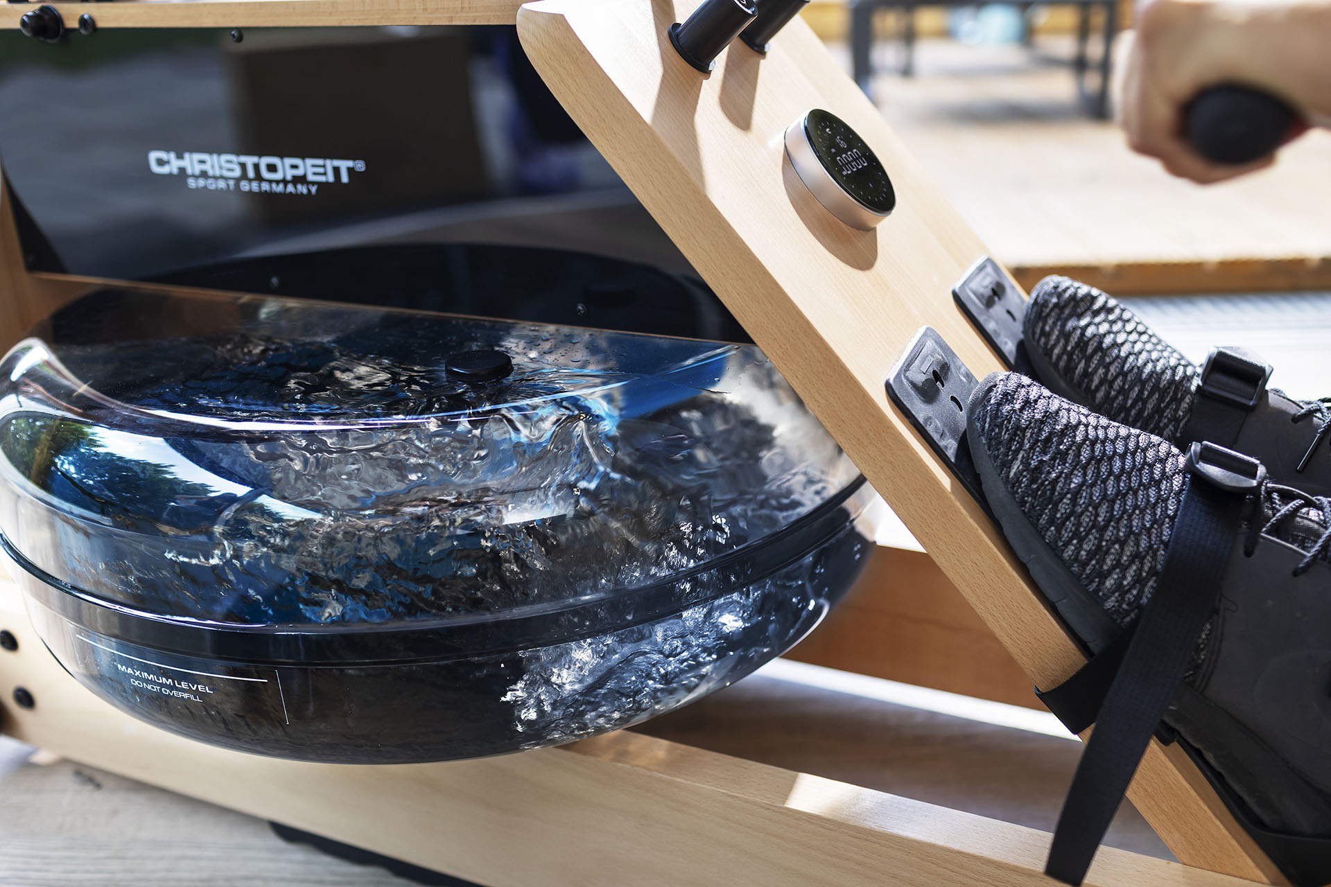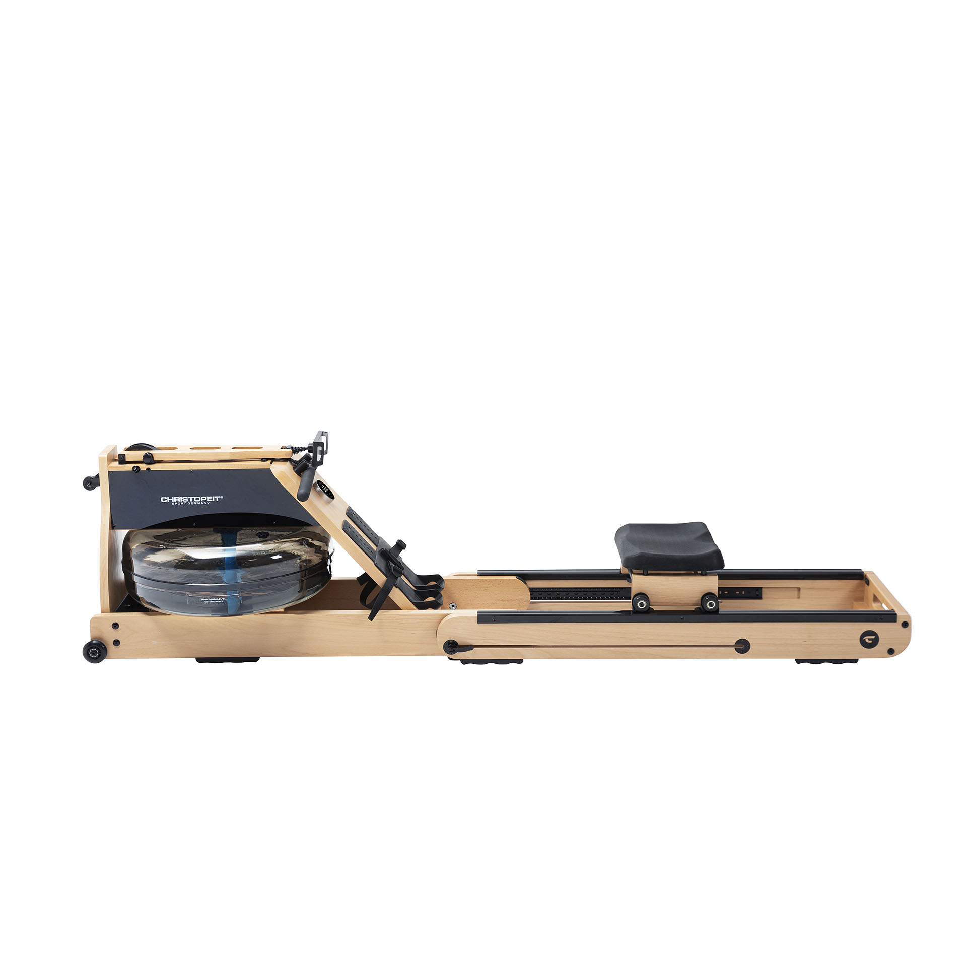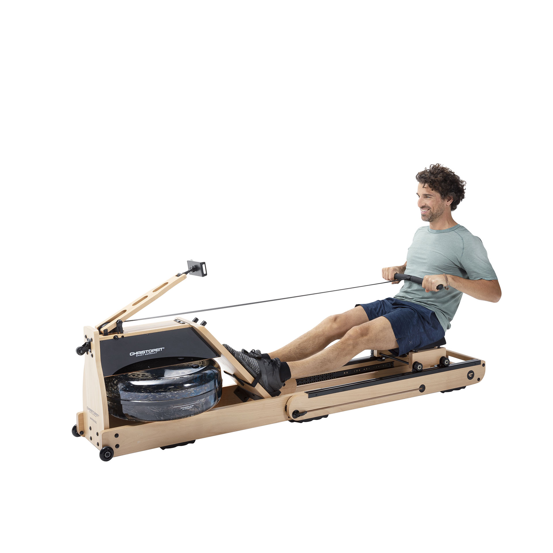 Tugevast tammepuidust valmistatud sõudeergomeeter Christopeit WP 5000. Stabiilse disainiga trenažöör simuleerib autentset ja liigesesõbralikku sõudetreeningut tänu innovaatilisele vastupanusüsteemile, mis koosneb veetakistusest ja otse reguleeritavast magnetilisest vastupanust.