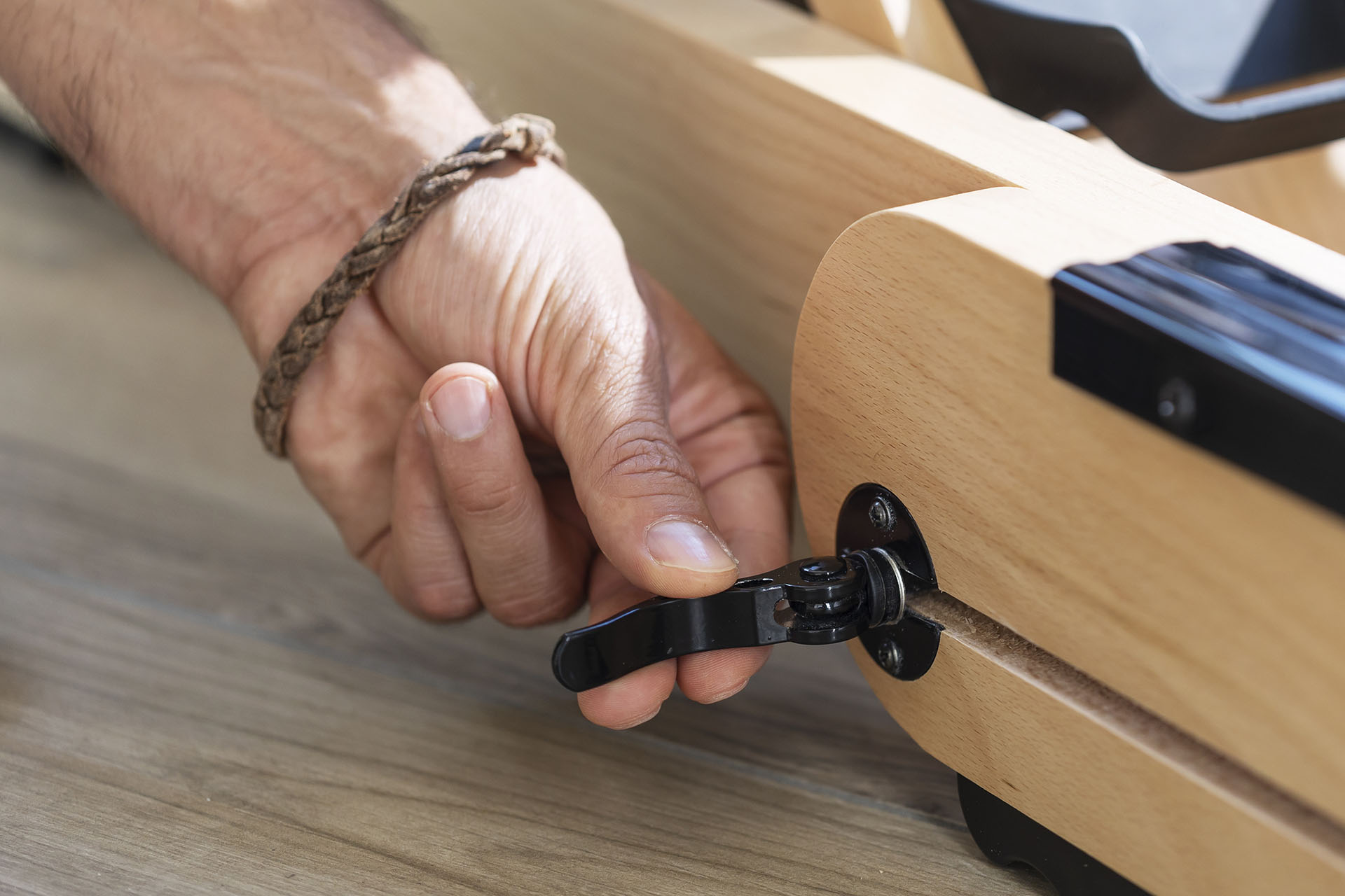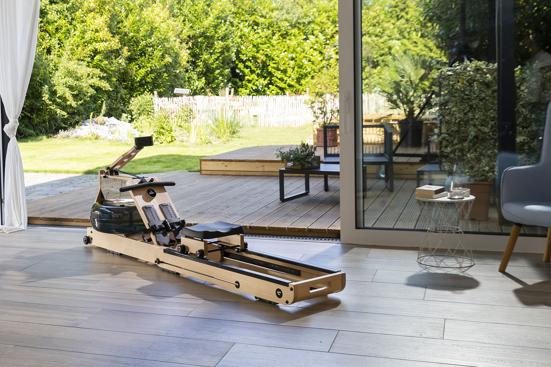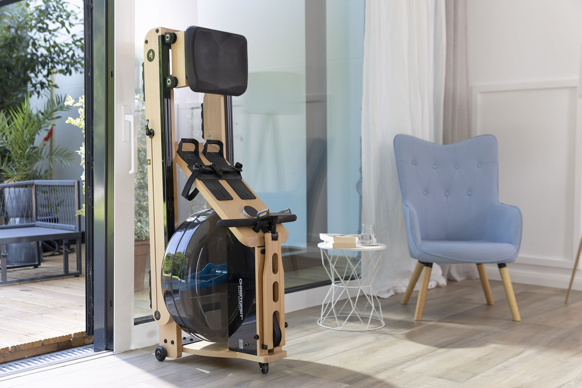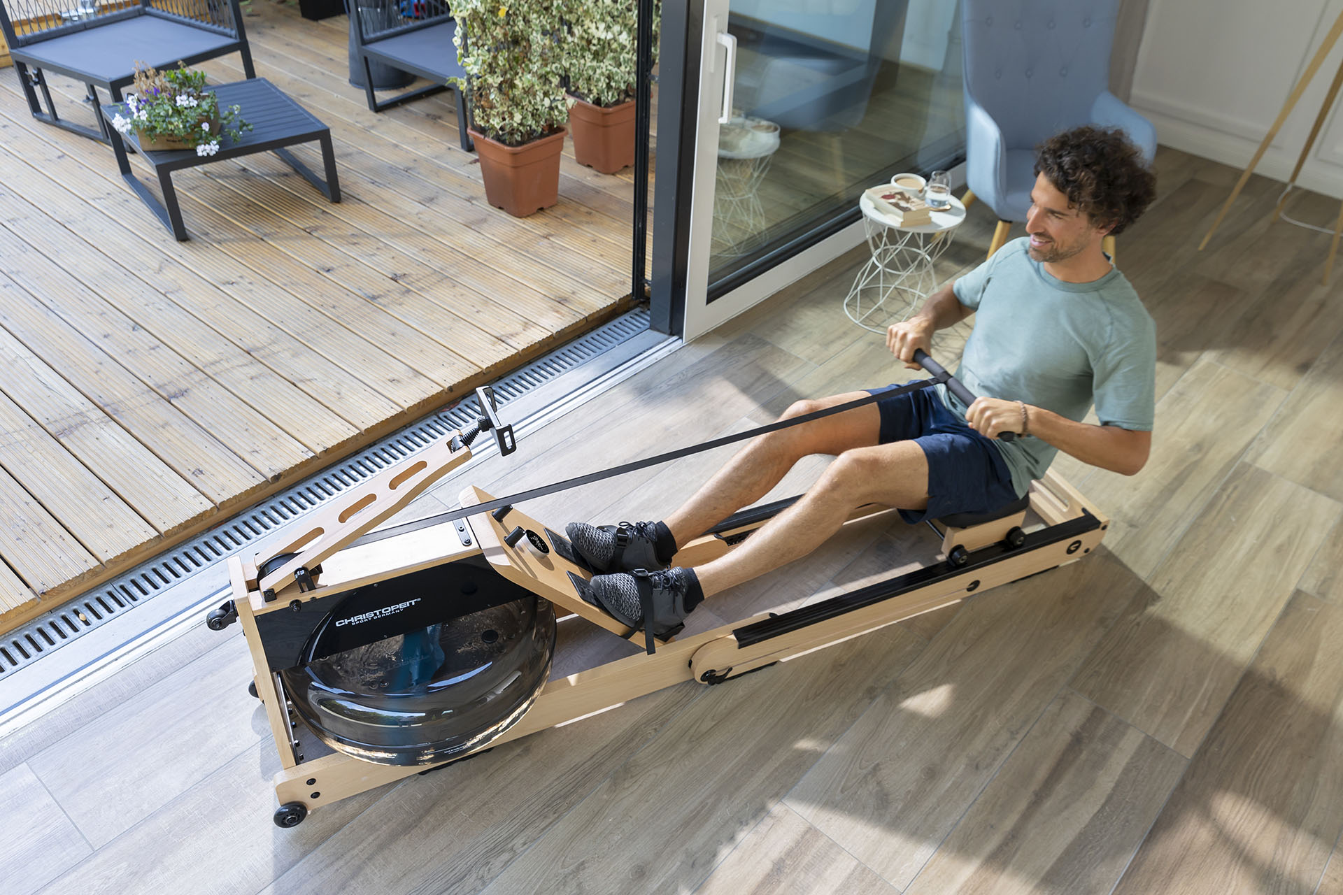 Tugevast tammepuidust valmistatud sõudeergomeeter Christopeit WP 5000. Stabiilse disainiga trenažöör simuleerib autentset ja liigesesõbralikku sõudetreeningut tänu innovaatilisele vastupanusüsteemile, mis koosneb veetakistusest ja otse reguleeritavast magnetilisest vastupanust.