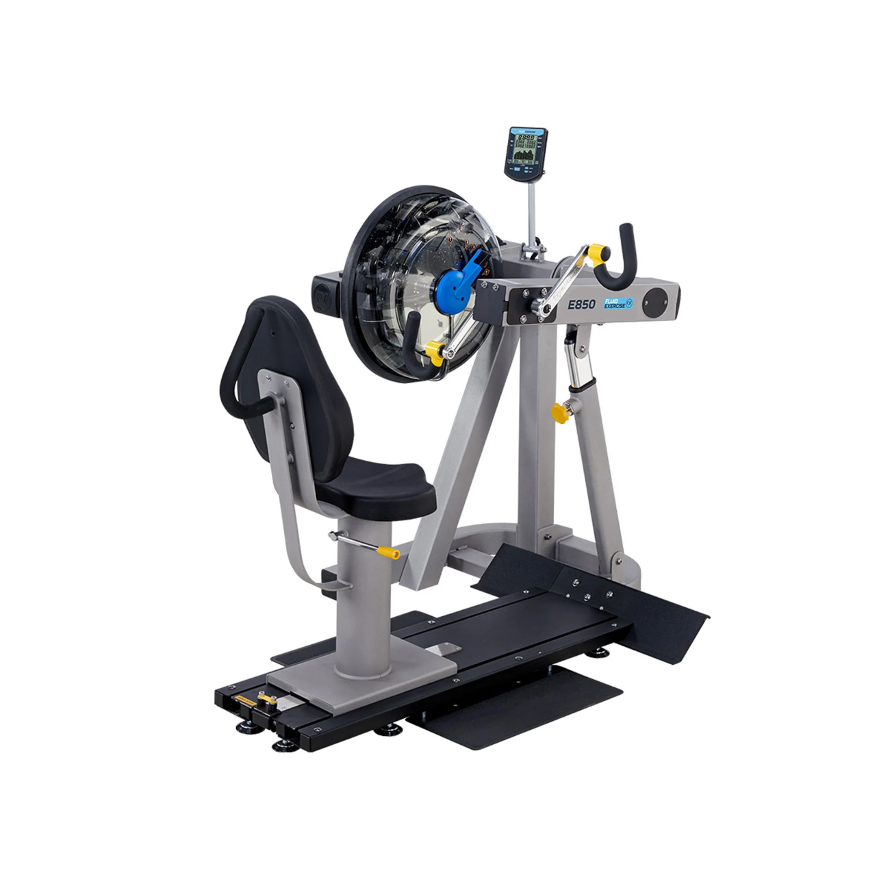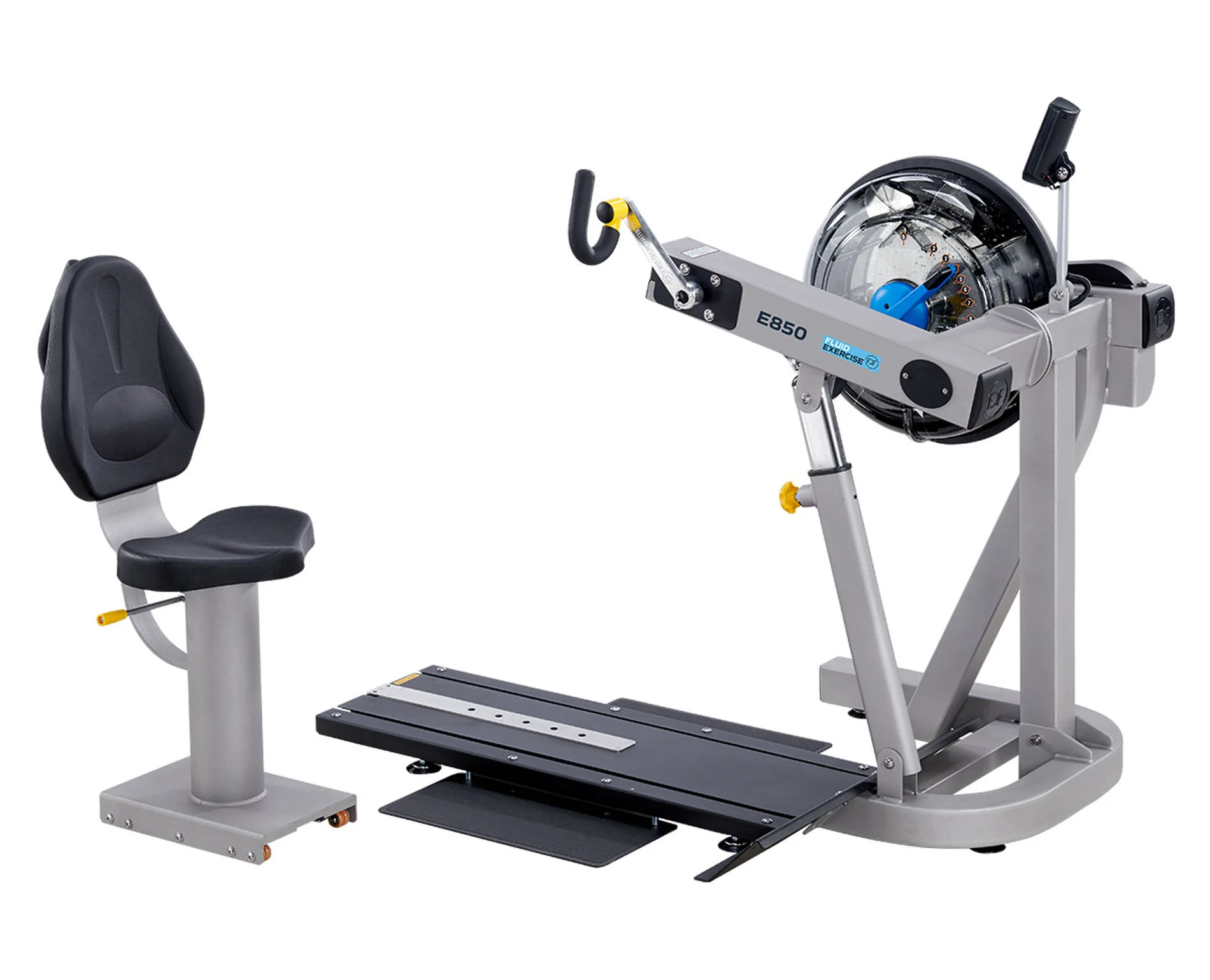 Fluid Exercise E850 on ülakehaergomeeter (Upper Body Ergometer), mis on kvaliteetne, sobib intensiivseks treeninguks ning seda saab kasutada kätega vändates nii istudes kui püsti seistes. Takistust saab reguleerida keerates nuppu paagil, takistus on sujuv igas astmes. Seade on sobilik nii tavatreeninguks kui ka taastusraviks. E850 ei vaja välist vooluallikat ning on paigutatav igale pinnale.